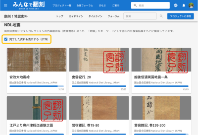 コレクションに含まれる資料が一覧表示されます。各資料の下には、資料名、所蔵先等、翻刻の進捗状況が表示されます。翻刻したい資料を選択すると、翻刻を入力する画面に移動します。