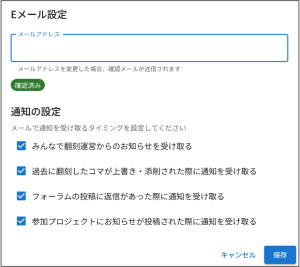 同じく右上のメニューから「Eメール設定」を選択すると、みんなで翻刻からの通知用のメールアドレスを登録できます。必要な通知の種類も選択できます。メールアドレスの登録・変更時には確認のメールが送信されます。